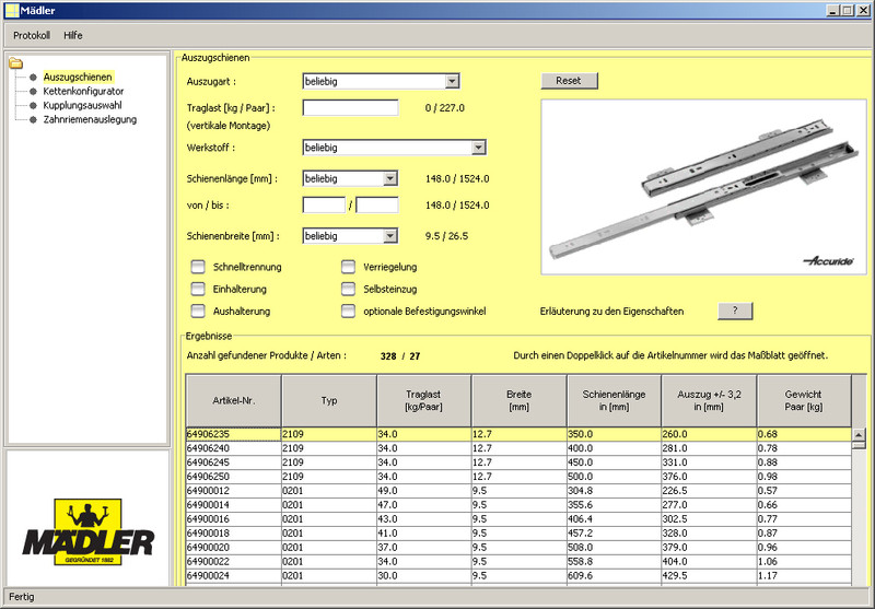 In Folgeprojekten wurden weitere Softwaremodule für die Auswahl von Kupplungen und Auszugsschienen sowie ein Kettenkonfigurator realisiert. Diese Softwaremodule wurden dann gemeinsam mit der Zahnriemenberechnungssoftware unter einer gemeinsamen Oberfläche zu den Mädler-Tools zusammengefasst.mehr...