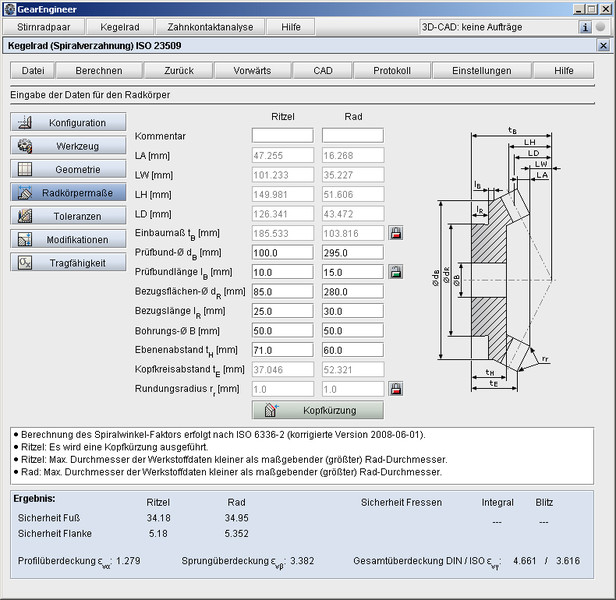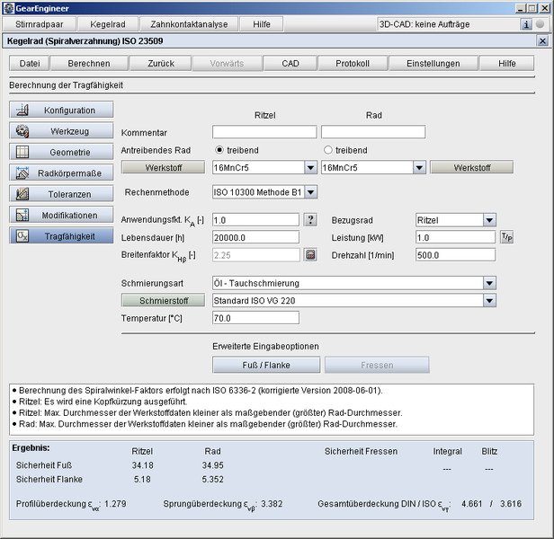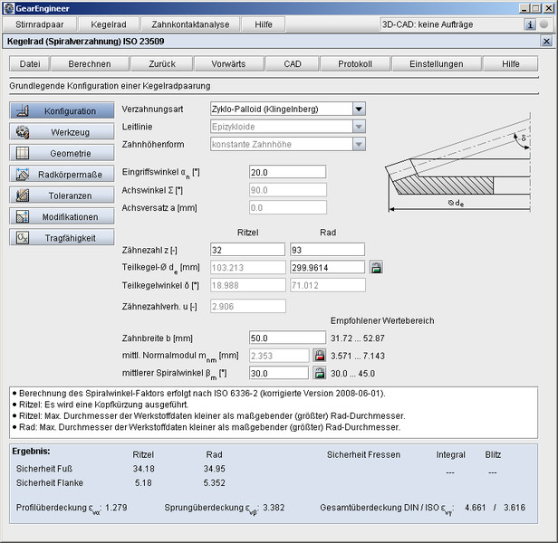 Neben der exakten Zahnformberechnung erfolgt die prinzipielle Geometrieberechnung nach ISO 23509 und KN 3028 sowie die Tragfähigkeit nach ISO 10300.