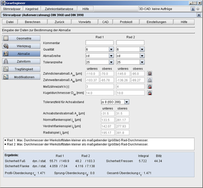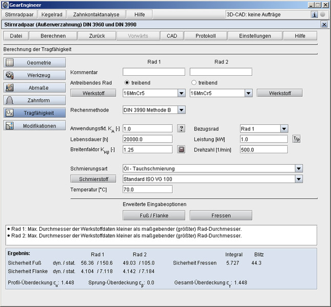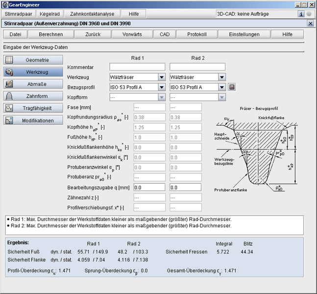 Mit dem Paket zylindrische Stirnräder steht ein leistungsfähiges Softwaremodul zur Auslegung und Optimierung von außen- und innenverzahnten Gerad- und Schräg-stirnrädern zur Verfügung. Neben einer umfangreichen Geometrieberechnung ist die Ermittlung und Ausgabe der exakten Zahnform inkl. von Profil- und Flanken-modifikationen möglich. Weiterhin kann die Tragfähigkeitsberechnung nach DIN 3990 und ISO 6336 durchgeführt werden.
