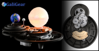 GaliGear is powered by a DC motor and can be controlled with a smartphone. The sun contains an array of LED's that are bright and dynamic. Using a patented lighting system, the LED's make the sun appear fluid and alive. The color of the sun will change with the seasons. The earth is tilted at 23 degrees and slowly moves around the sun while the moon circles the earth. Kids can see and understand why the earth has seasons, why we have night and day, why eclipses occur and why the moon has phases. There are many types of gears in GaliGear. This includes cylindrical gears, planetary gear trains or bevel gears. GaliGear shows how to use the many types of gears and geometries to model the motion of the earth and moon around the sun.