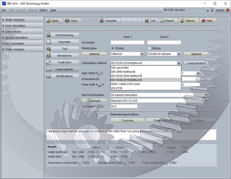 In the latest version, the calculation modules for cylindrical gear pairs, planetary gear stages, three- and four-gear train systems as well as gear racks have been extended to include the latest edition of ISO 6336 (2019-11) for calculating the load capacity as well as VDI 2736 for calculating the load capacity of plastics. These calculation methods are available in parallel to DIN 3990 Method B, ANSI/AGMA 2101-D04 and the previous edition of ISO 6336 (2006-09).